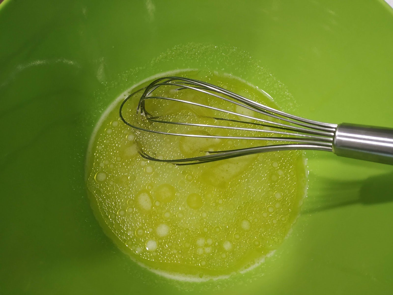 Cogemos un bol y ponemos el azúcar y el aceite, con la ayuda de unas varillas mezclamos bien,